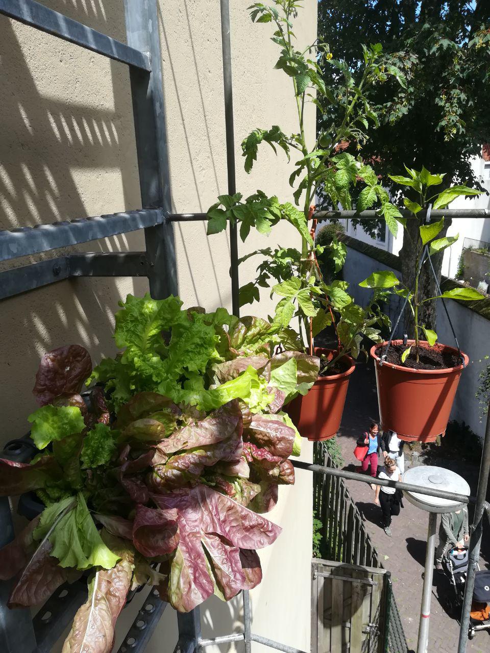 Despite living in a student room without access to a garden, I managed to create an improvised hanging city garden on my fire escape. I am aware that this doesn’t sound like the smartest idea, but the fire escape is no longer in use and not an official flight path. Growing vegetables in my own room is not an option first of all due to space limitations, but mostly due to lack of direct sunlight. My windows face north/east, whereas the fire escape is on the south side of the house. On the fire escape there is nevertheless still no space for larger vegetables such as courgettes, so I started my green journey with three cherry tomato plants, a pepper plant, loose leaf lettuce, and basilicum.