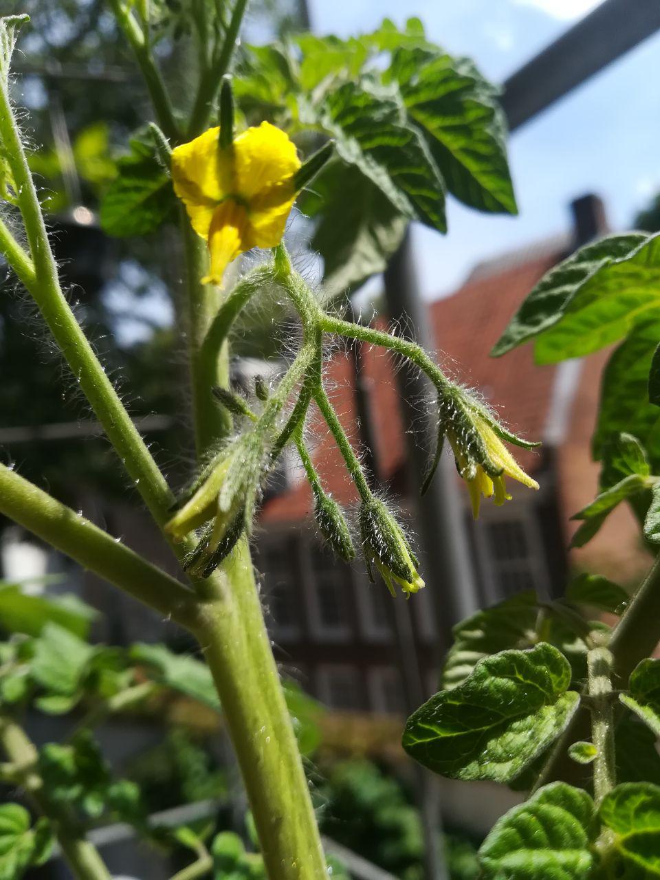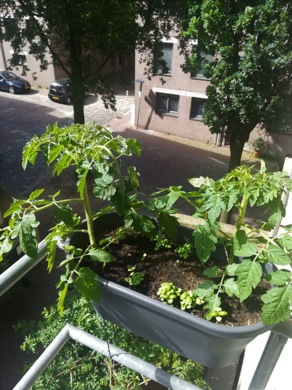 I sowed a lot of loose leaf lettuce in the beginning of June. I repotted two other tomato seedlings and brought them outside in the second week of June. By now the tomato plant I brought out the first was already quite big. When planting the young tomato plants I dug them in until their main leaves, for extra stability. I also buried the original motor leaves. I planted some basilicum under the tomatoes, just curious how that would grow.