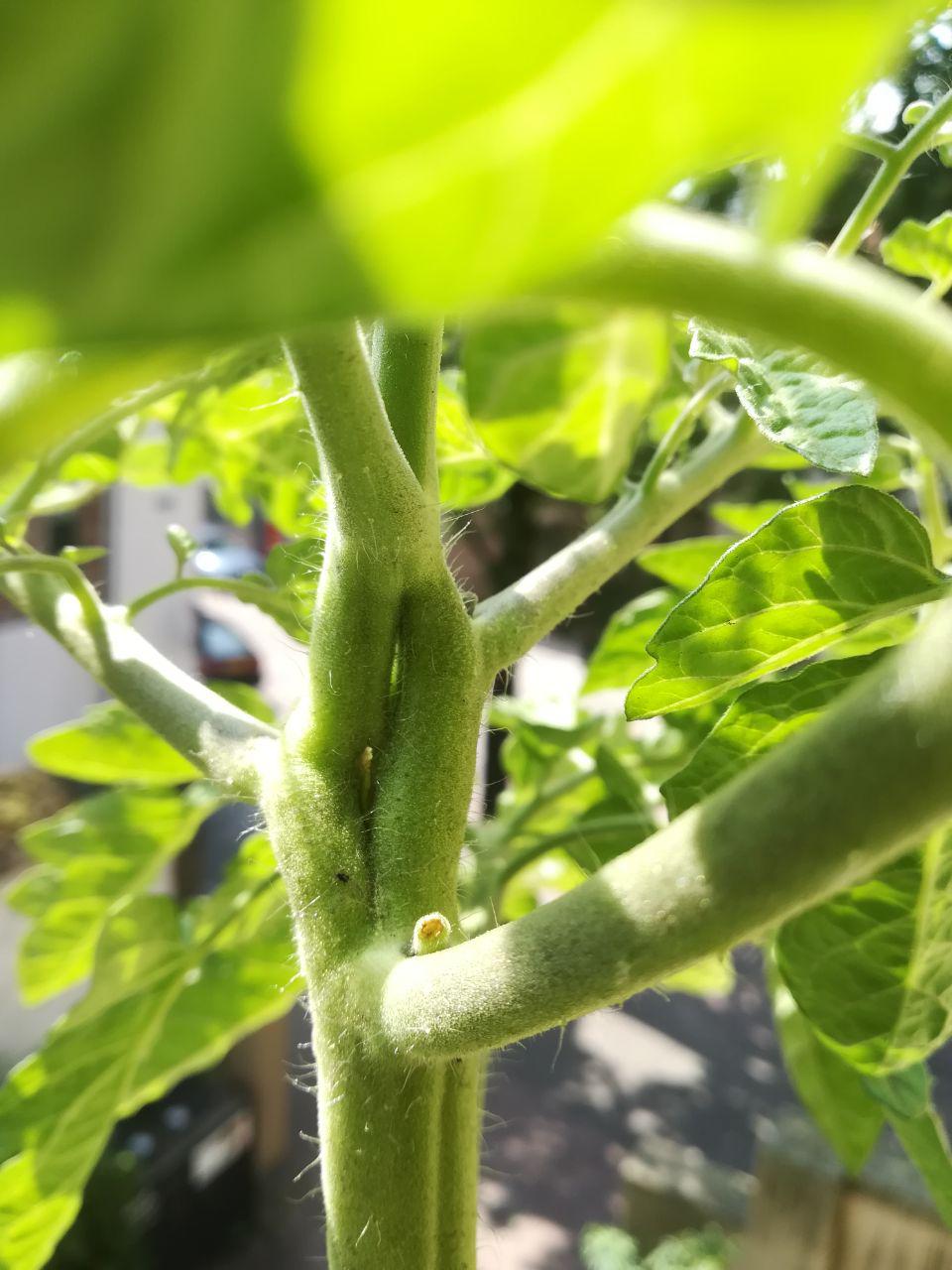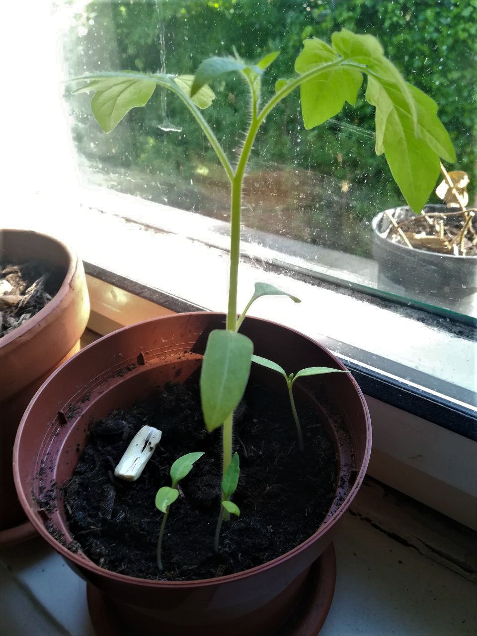 I sowed the tomato seeds inside in plastic containers under plastic in the second week of April. Multiple seeds sprouted in the next two weeks. At 15 May one tomato plant was 5-6 times bigger than the other seedlings, so I repotted it and put it outside. Around that time I also brought the pepper seedling outside, which I had received from a friend. I brought both in at colder nights.