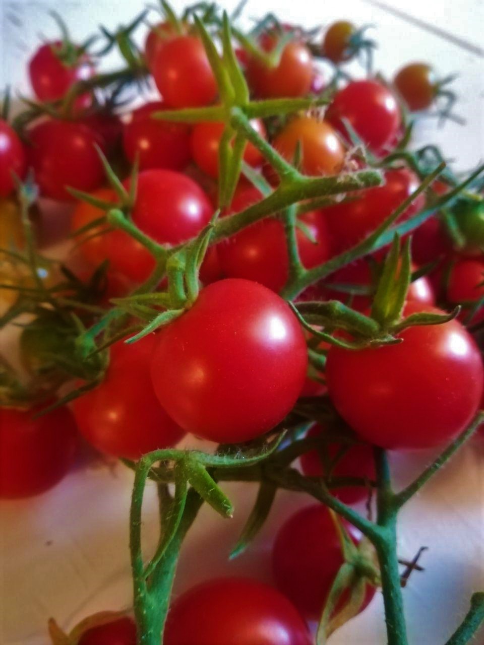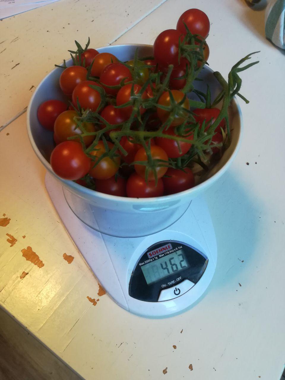 End of August a significant amount of tomatoes were ready for a long time already, and some were starting to drop or burst. Harvest time! A few tomatoes were still a bit greenish or orange. All plants were also still making many new tomatoes, but they will not come to fruition as sun will become increasingly scarcer this time of year in the Netherlands.